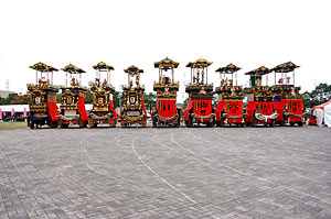 ズラリと並ぶ山車揃え.壮観だけど、写真を撮ると人がウジャウジャ写ってしまう.