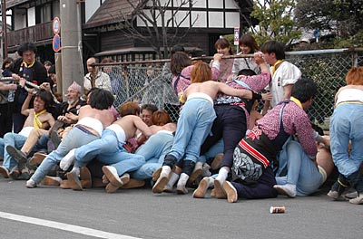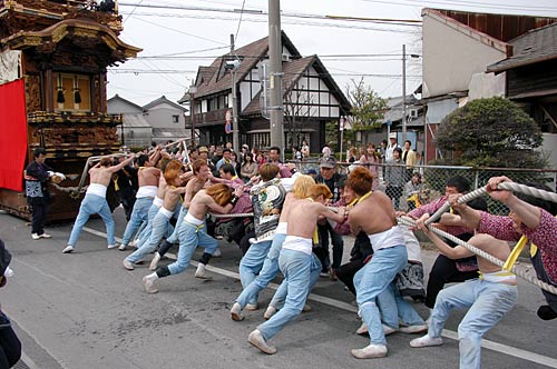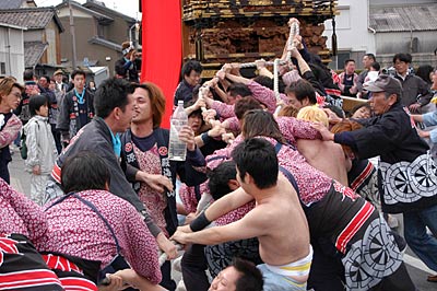 | 乙川まつりには喧嘩まつりという異名もあるそうな.大乱闘のようでもあるがご安心召されよ. 喧嘩ではござらぬ. 左右に分かれ曳き綱を高くかかげ、押し合い力を競う.だから決して喧嘩ではない. |