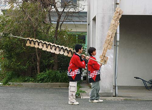 子供の頃、下駄を投げて下駄が表を向いたら「晴れ」、裏返しになったら「雨」などと遊んだ事はないだろうか.坂井では山車の上から一斉に下駄を投げて今年の豊作を占う. |