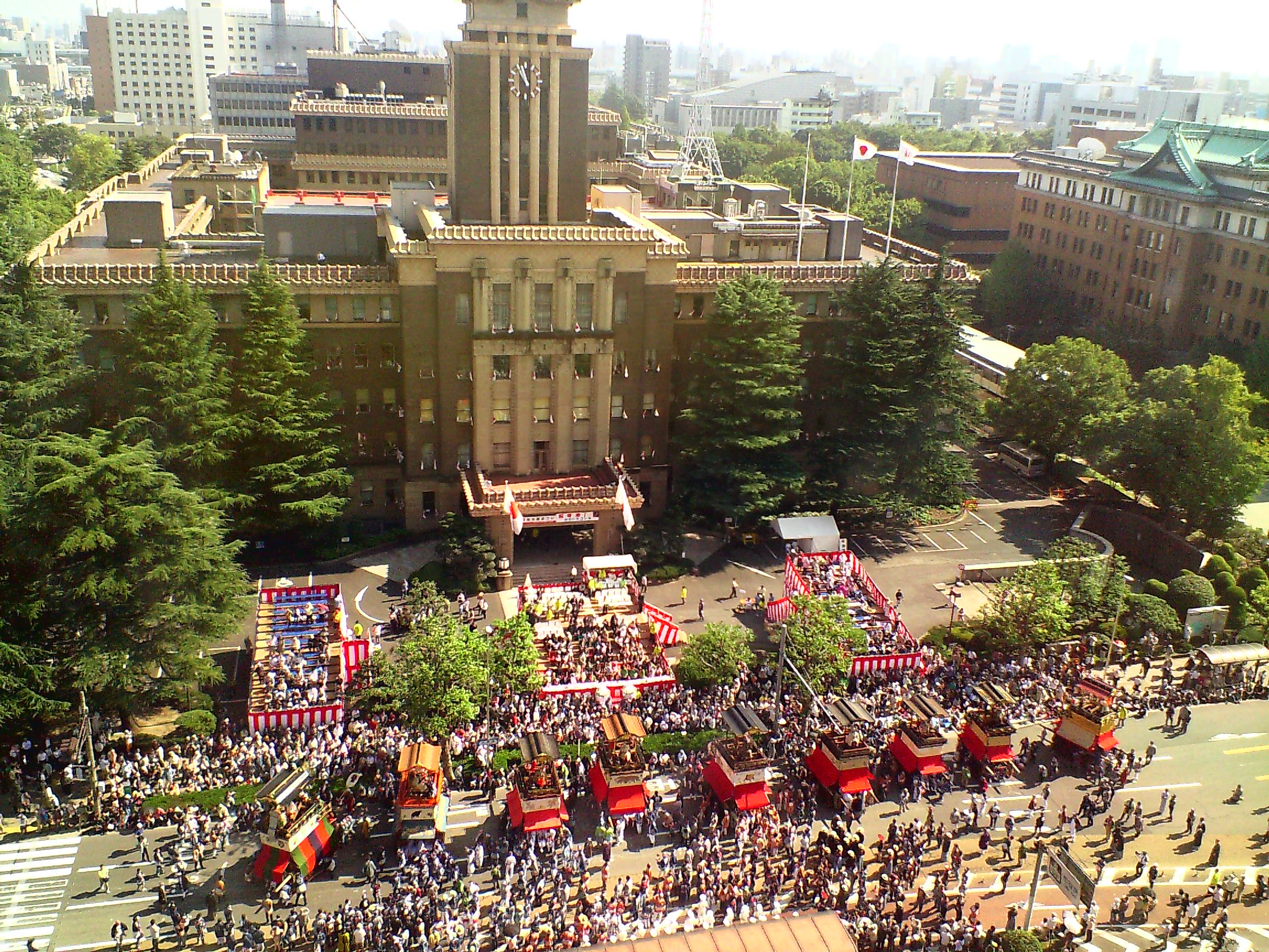 名古屋まつりの山車揃で9輌の山車が市役所前に並んだところです.
