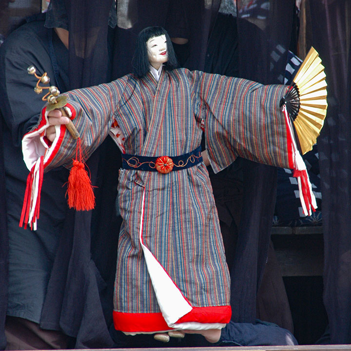 知多地方に多い三番叟や巫女舞など前棚の隠れ三人遣いで、直接人形を操作する場合と、上山で能舞など糸からくりで演じられるものがある。