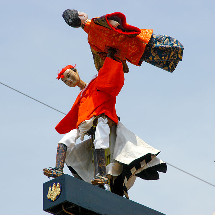 蓮台、別の人形の肩、木の上などで逆立ちをして太鼓や鉦を打つ。
