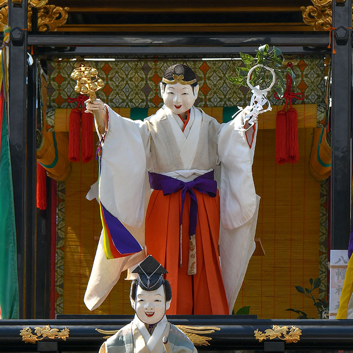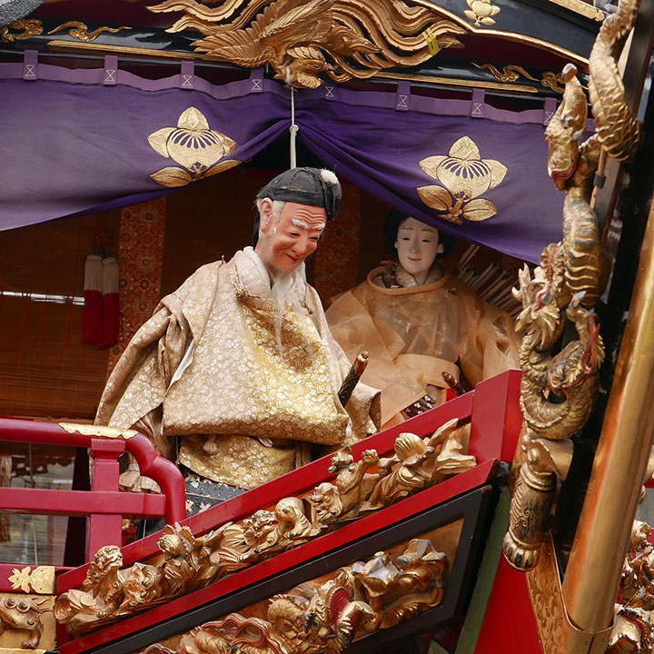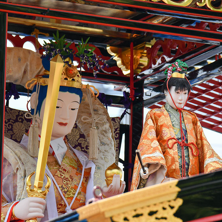 人形4体:采振り人形、狂言師(神官)、武内宿禰、神功皇后