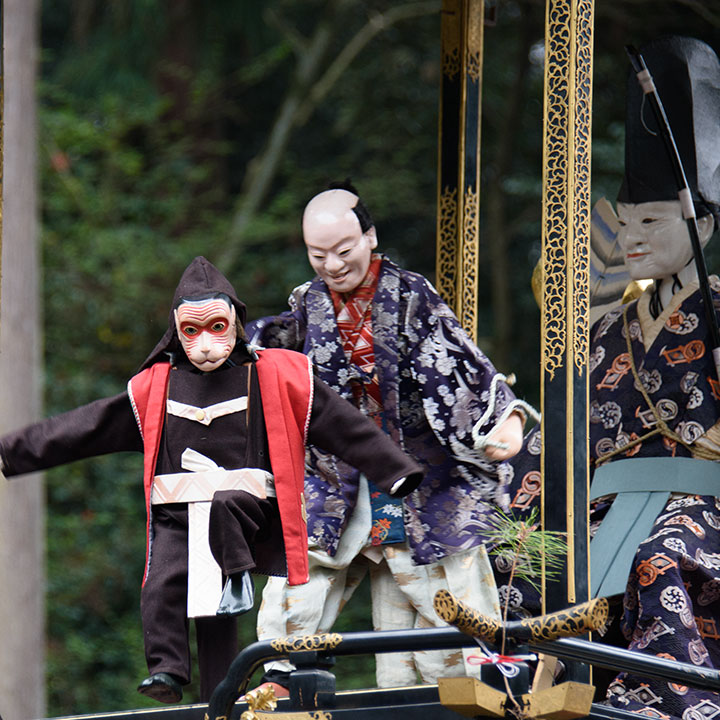 人形4体:前人形(太郎冠者)、童子(猿)、猿回し、大将人形(殿様)