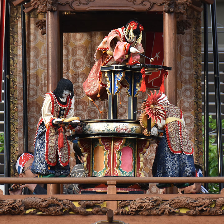 現在のからくりは絵図と保存されていたからくりの部材を基に、令和4年(2022)九代目玉屋庄兵衛によって復元されたものである。