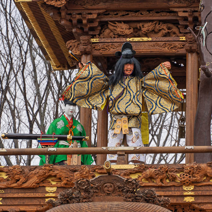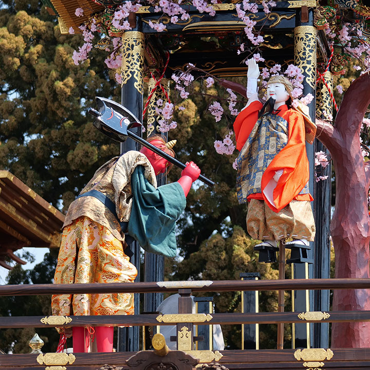 まず赤鬼が見守る中、役小角が高さの異なる6本の杭を渡り、桜の枝へと移る。その後、役小角はぶら下がったまま桜吹雪とともに山車の外へと去っていく。これと同時に、赤鬼は青鬼へと姿を変え、激しい舞を披露する。