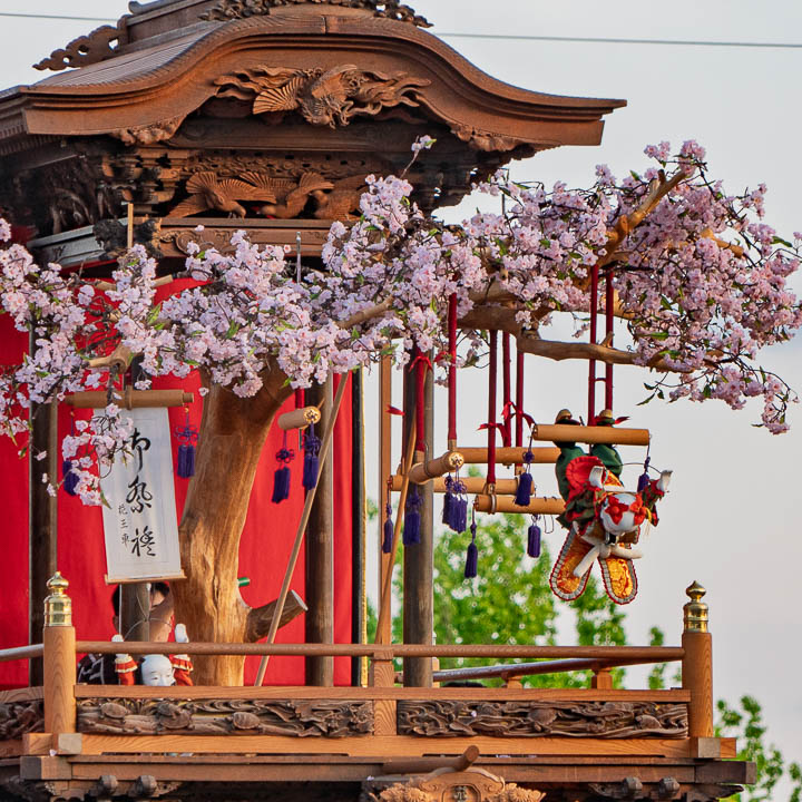 そして大唐子から桜の木に移った小唐子は、ぶら下がりながら山車の内部に下りて行く。