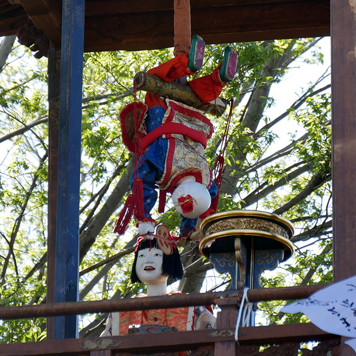 演技次第:小唐子が蓮台に片手で倒立して、綾棒に足を掛けてぶら下がる。