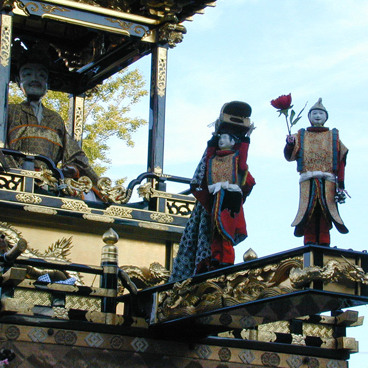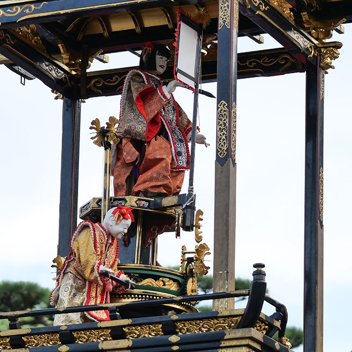 演技次第:牡丹の花と鈴を持つ唐子と獅子頭を被る2体の唐子で獅子舞を演じる。 からくりは出樋で演じられる。