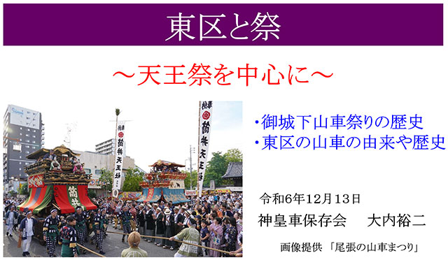 これは令和6年(2024)12月13日に開催された名古屋市東生涯学習センター主催の講座より、神皇車保存会大内裕二講師による『東区と祭~天王祭を中心に~』をまとめたものです。