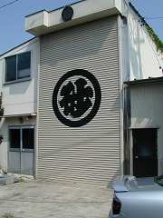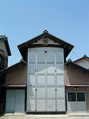 平成11年までの旧さや | シャッターに非常に大きく丸に砂の組紋が描かれており目立ちます.裏の民家から延びてきたツタが屋根にかかっており,いつかは「ツタのからまるサヤ」に? |