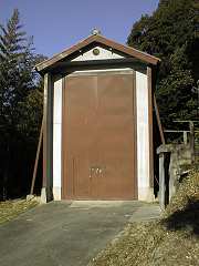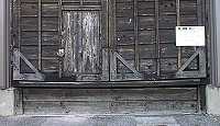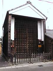 有松駅近くの旧東海道に面して建ちます.外壁・扉ともに木造で戦前の建物.西組の倉とよく似た形状. | 中町の山車倉と同様,外壁・扉ともに木造.旧東海道筋の西の外れに建ちます.不思議なのは正面の瓦に「東組」の文字があるように見えるのですが?(私の勘違いか?) |