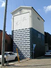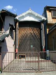 | 両隣りの建物にキッチリ挟まれて窮屈そうです. | 扉に青海波の文様がきれいに描かれています. | 純土蔵造りです. | 熊野社の境内に建ちます. |