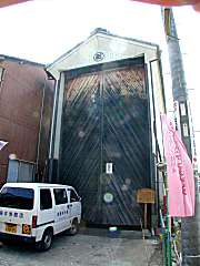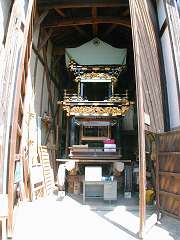 | 船型の車山が保管されています. | 古く明治42年の建造で,ここも両端を商家に挟まれています. 上山を上げると収容不可能になり,祭礼期間中は車山は外に保管する. |